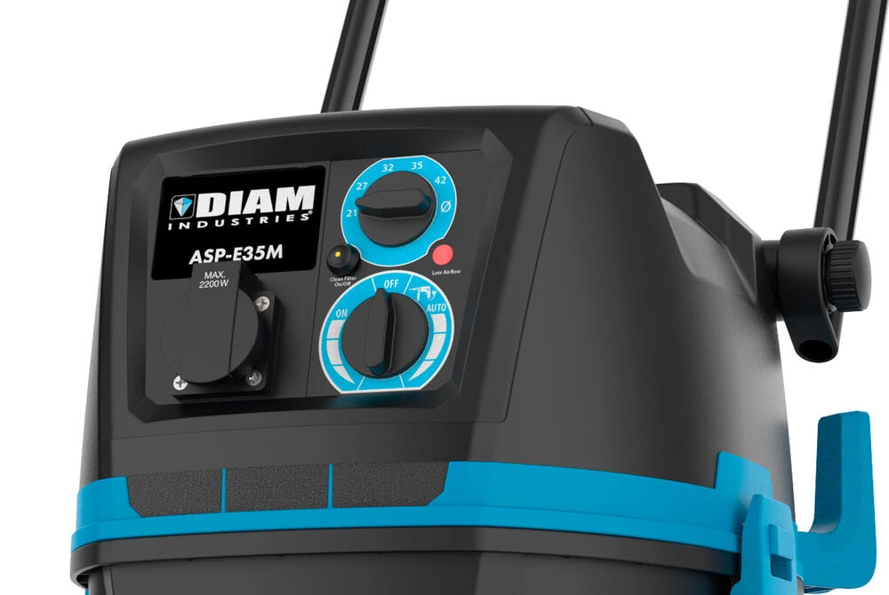 Aspirateur ASP-E35M DIAM INDUSTRIES pour l’eau et les poussières dangereuses pour la santé ; 230 V ; 1 200 W ; classe M ; réservoir 35 l. ; débit d’air 74 l/s ; Dépression 250 mbar ; niveau sonore 75 dB(A)