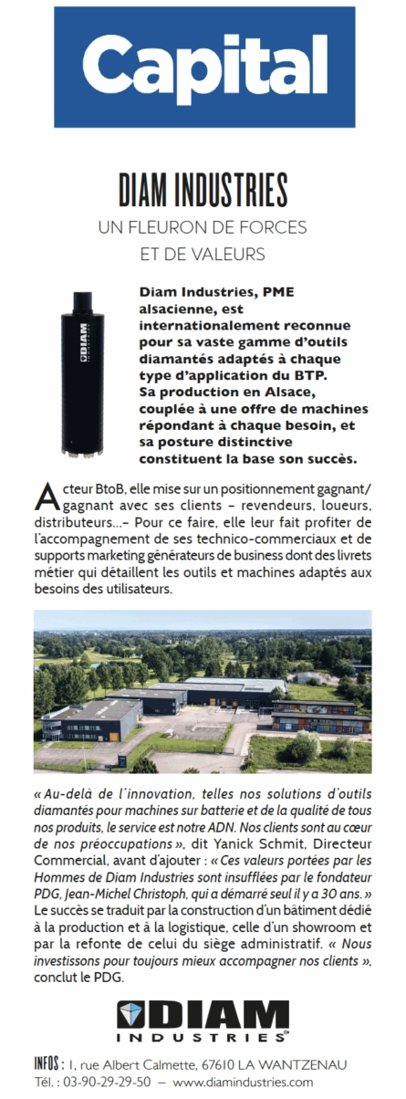 Diam Industries, PME alsacienne, est internationalement reconnue pour sa vaste gamme d’outils diamantés adaptés à chaque type d’application du BTP. Sa production en Alsace, couplée à une offre de machines répondant à chaque besoin, et sa posture distinctive constituent la base son succès.